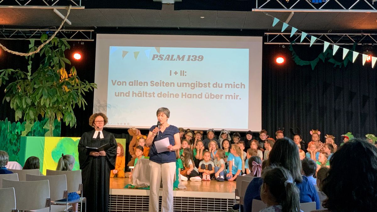 Im Anschluss griff Pfarrerin Frau Meder-Matthis von der Evangelischen Kirchengemeinde in Möhringen das Thema in einem kurzen Impuls auf und ermutigte die Kinder, sich mutig auf das Neue einzulassen und ohne Angst in diesen neuen Lebensabschnitt zu gehen. Gemeinsam wurde das Vaterunser gebetet und alle Erstklässlerinnen und Erstklässler wurden unter Handauflegung gesegnet. Danach ging es mit den Klassenlehrerinnen in die Klassen zur ersten „Unterrichtsstunde“.