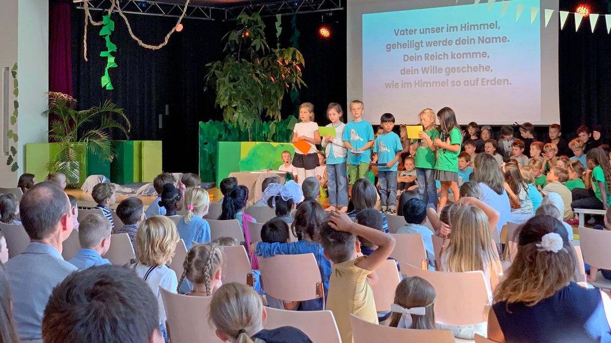 Am 19. September 2025 begann der Einschulungsgottesdienst unserer neuen Erstklässler und Erstklässlerinnen mit einem musikalischen Beitrag einer Schülerin der 2. Klasse. Gespannt saßen die 76 Kinder in den ersten Reihen des FES Forums und schauten neugierig und erwartungsvoll auf die Bühne, wo die 2. Klässler bereits bereitstanden, um mit Liedern und einem Mini-Musical die neuen FES Schülerinnen und Schüler willkommen zu heißen.