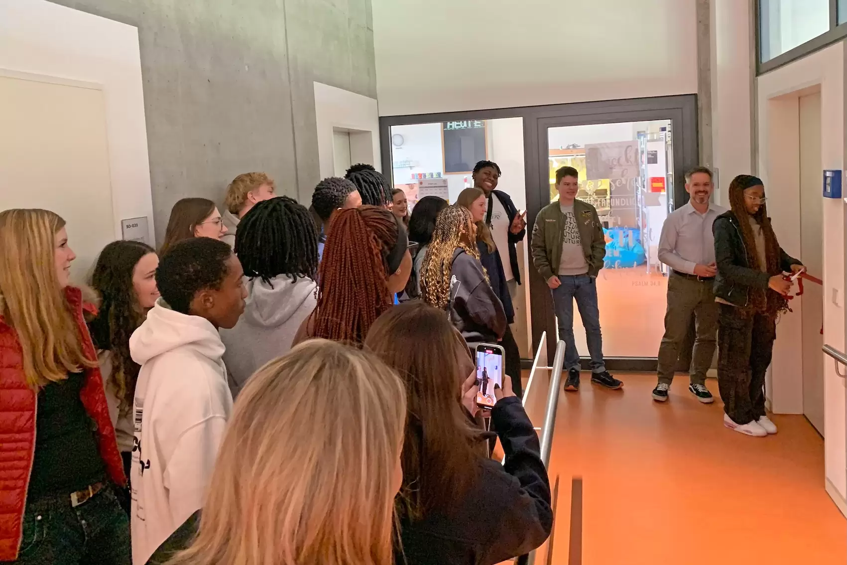Ein weiteres Highlight war die feierliche „Taufe“ unseres Besprechungszimmers, das nun den Namen unserer Partnerschule in Südafrika trägt. Unter großem Applaus durchschnitt eine der südafrikanischen Schülerinnen das rote Band. Im Raum betrachteten alle begeistert die Bilder der Maragon Mooikloof-Schule und der bereits stattgefundenen Schüleraustausche.