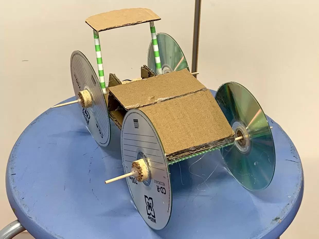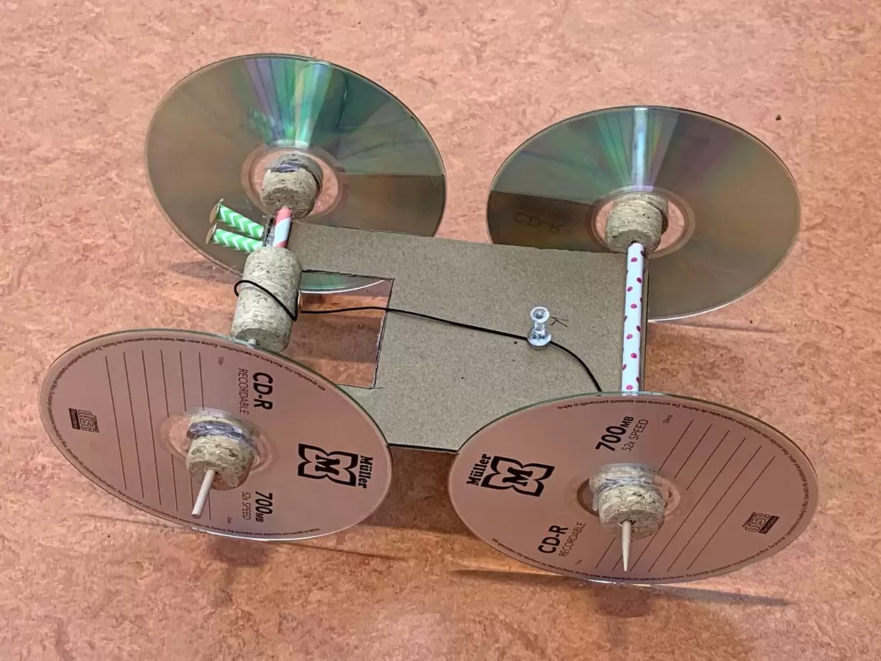 Jetzt wird es praktisch: Mithilfe einer Videoanleitung bauen die Teams in Phase 2 ein aufziehbares Auto. Doch damit ist die Aufgabe nicht erledigt – im Gegenteil. Die Schülerinnen und Schüler müssen das Fahrzeug optimieren, sodass es möglichst weit und stabil fährt.