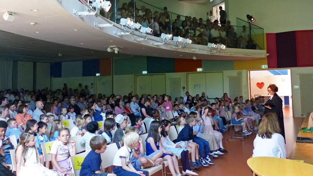 Im Anschluss griff Pfarrerin Frau Meder-Matthis von der Evangelischen Kirchengemeinde in Möhringen das Thema in einem kurzen Impuls auf und ermutigte die Kinder, sich mutig auf das Neue einzulassen und ohne Angst in diesen neuen Lebensabschnitt zu gehen. Gemeinsam wurde das Vaterunser gebetet und alle Erstklässlerinnen und Erstklässler wurden unter Handauflegung gesegnet. Danach ging es mit den Klassenlehrerinnen in die Klassen zur ersten „Unterrichtsstunde“.