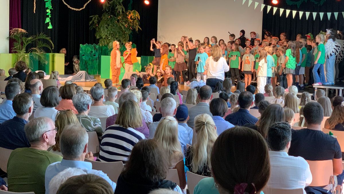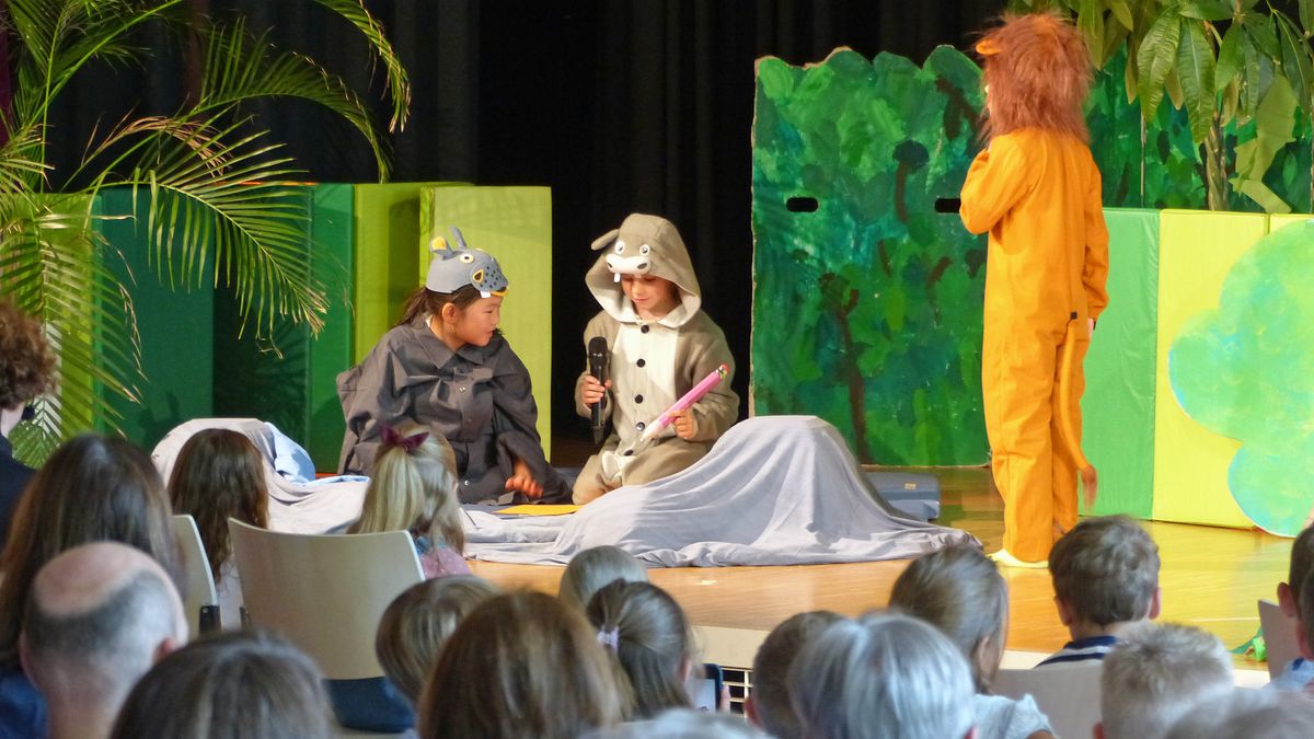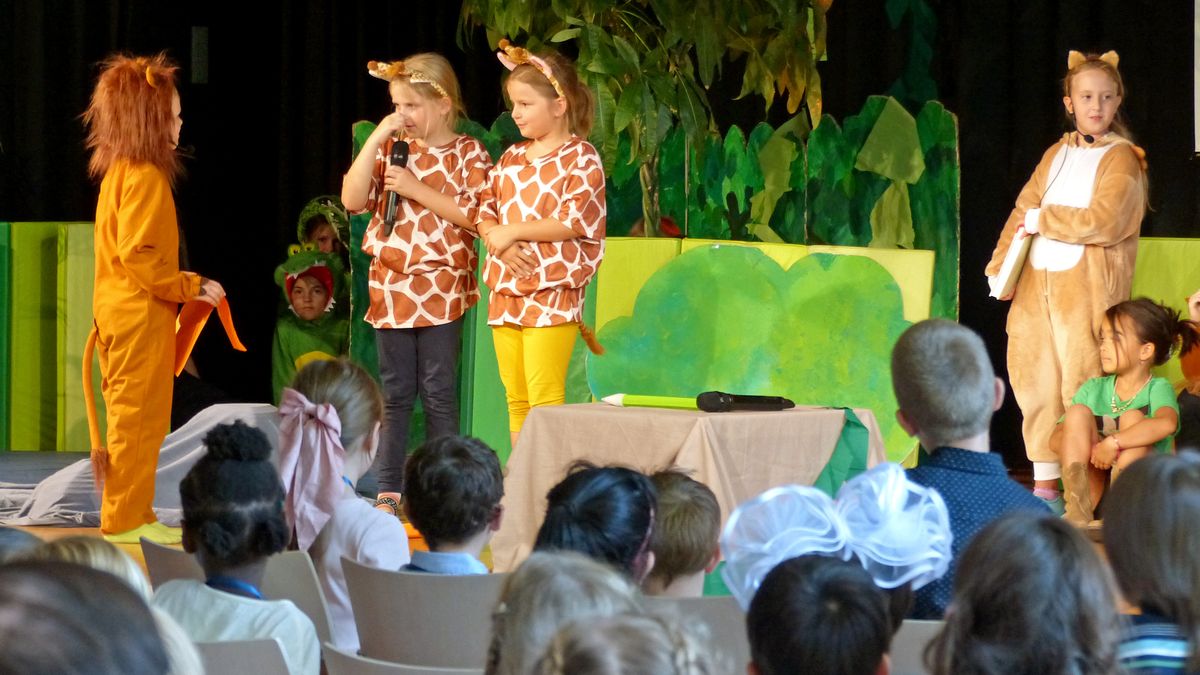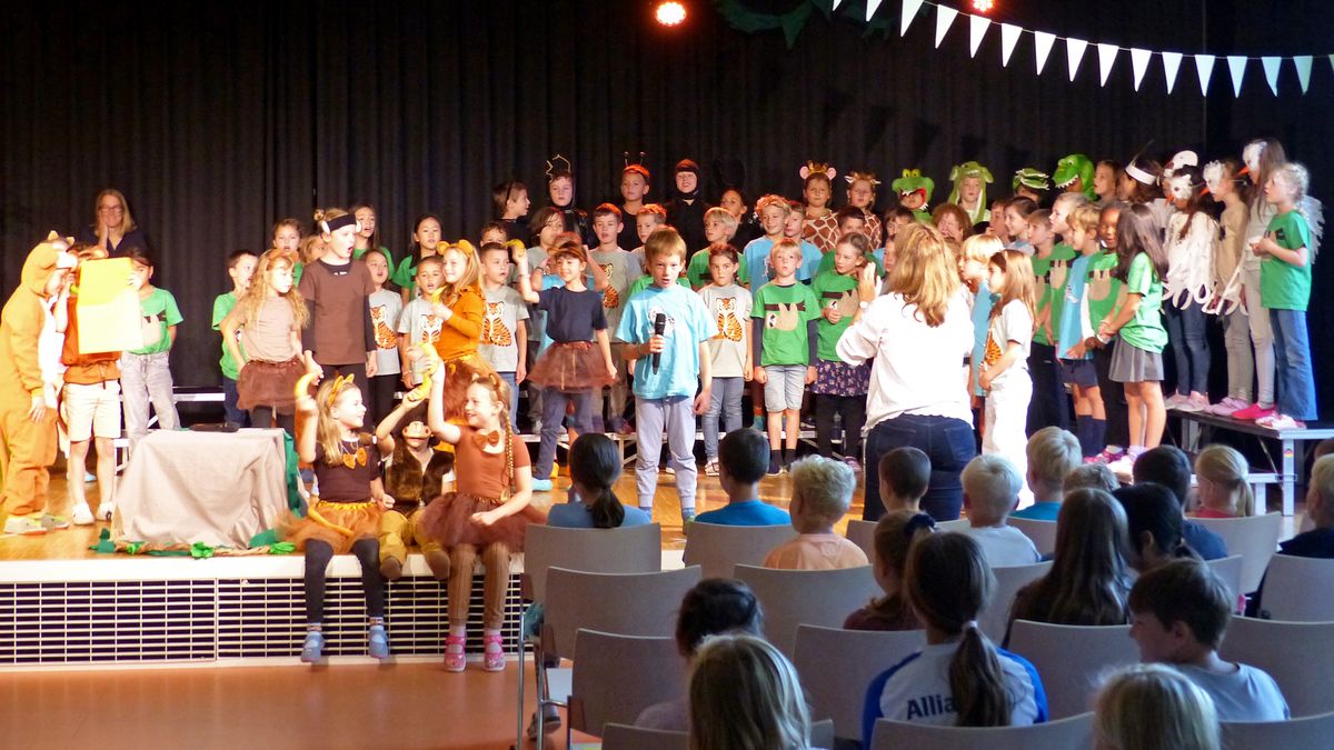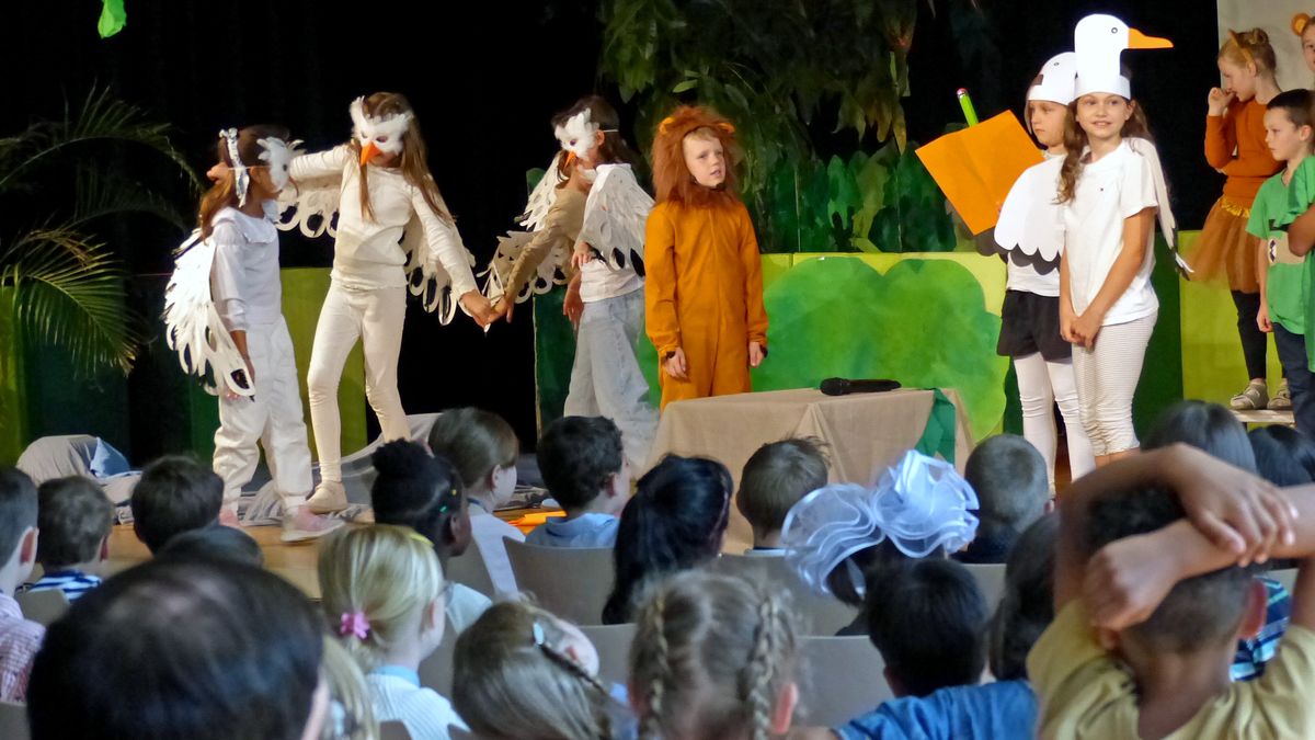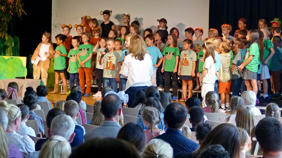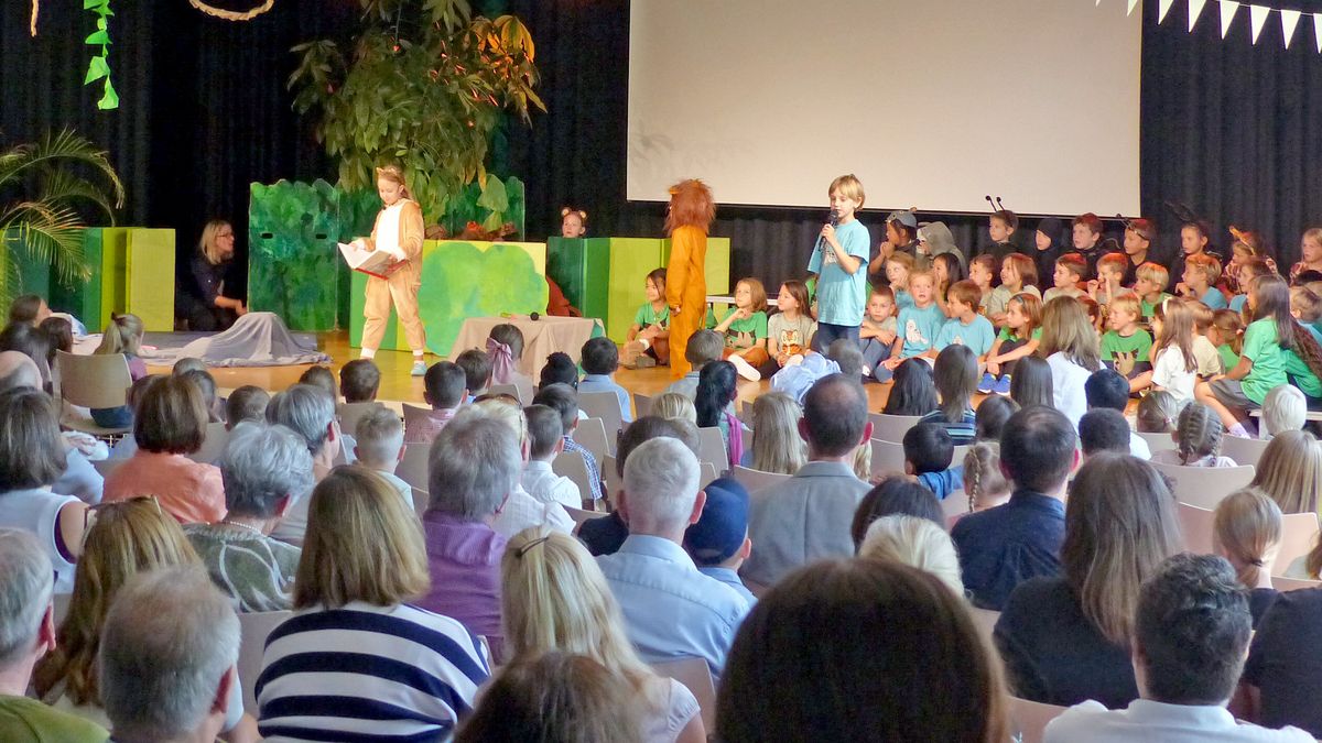 Die Geschichte, die sie einstudiert hatten, handelte von einem Löwen, der nicht schreiben konnte und es auch nicht lernen wollte, bis er eine Löwin traf, die gerne las. Bekannte Liedmelodien wurden mit lustigen neuen Texten versehen und zu Ohrwürmern. Die kleinen Schauspielerinnen und Schauspieler sowie Solistinnen und Solisten und der gesamte Chor waren mit großem Eifer dabei und zeigten viel Talent und Freude am Spielen und Singen. Nicht nur die neuen Erstklässlerinnen und Erstklässler waren begeistert, auch die Gäste, ob groß oder klein, waren beeindruckt von dem, was die Kinder der 2. Klassen mit ihren Lehrerinnen auf die Beine gestellt hatten.