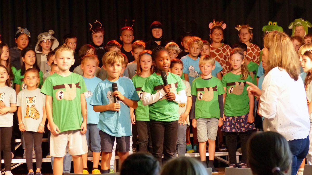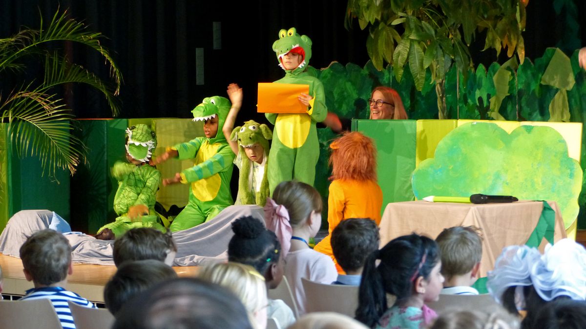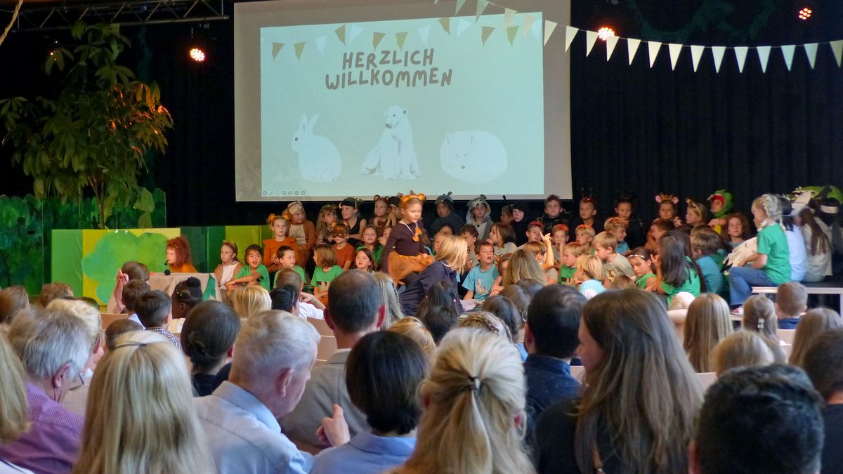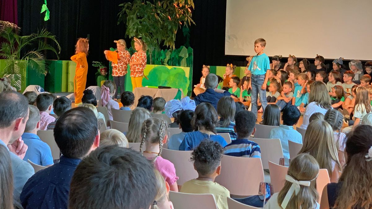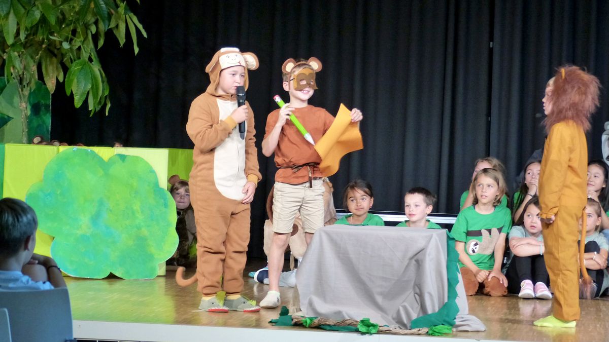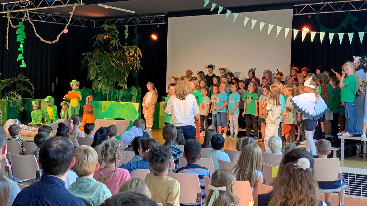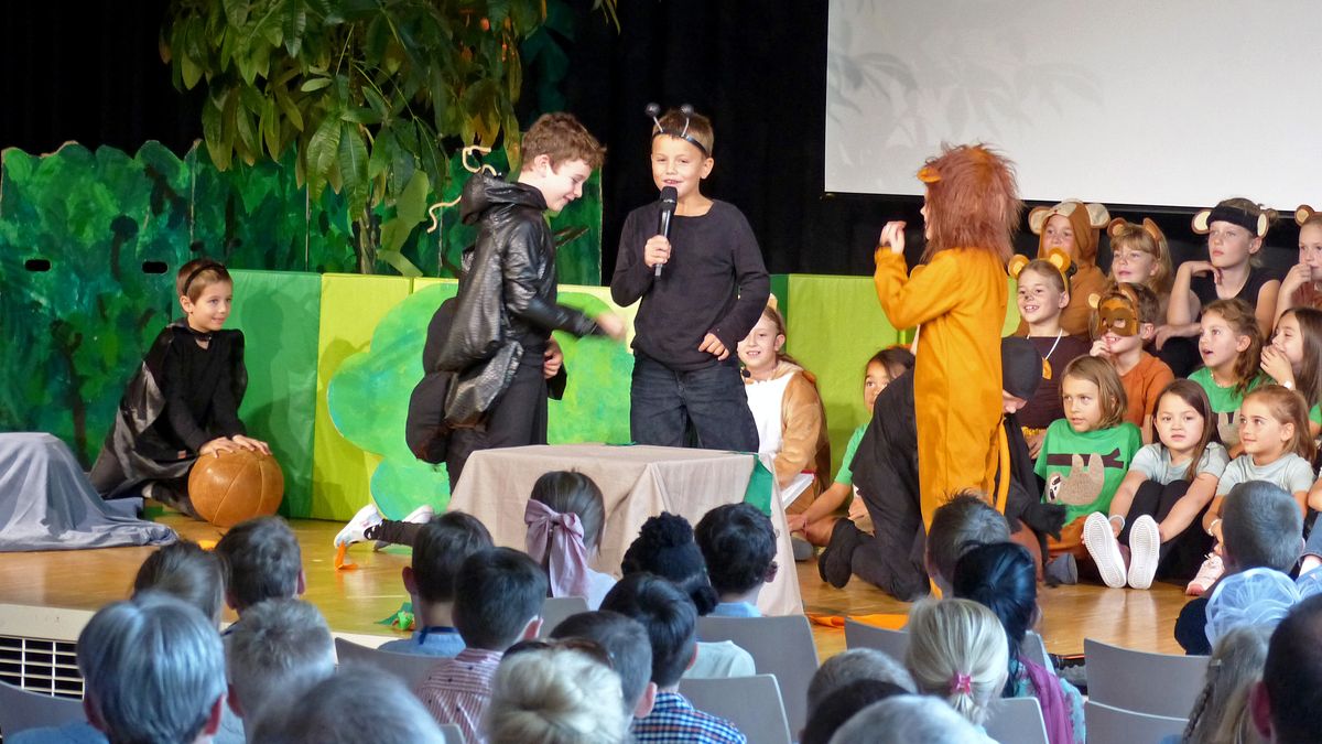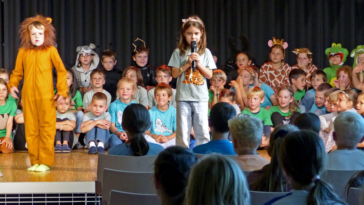 Die Geschichte, die sie einstudiert hatten, handelte von einem Löwen, der nicht schreiben konnte und es auch nicht lernen wollte, bis er eine Löwin traf, die gerne las. Bekannte Liedmelodien wurden mit lustigen neuen Texten versehen und zu Ohrwürmern. Die kleinen Schauspielerinnen und Schauspieler sowie Solistinnen und Solisten und der gesamte Chor waren mit großem Eifer dabei und zeigten viel Talent und Freude am Spielen und Singen. Nicht nur die neuen Erstklässlerinnen und Erstklässler waren begeistert, auch die Gäste, ob groß oder klein, waren beeindruckt von dem, was die Kinder der 2. Klassen mit ihren Lehrerinnen auf die Beine gestellt hatten.