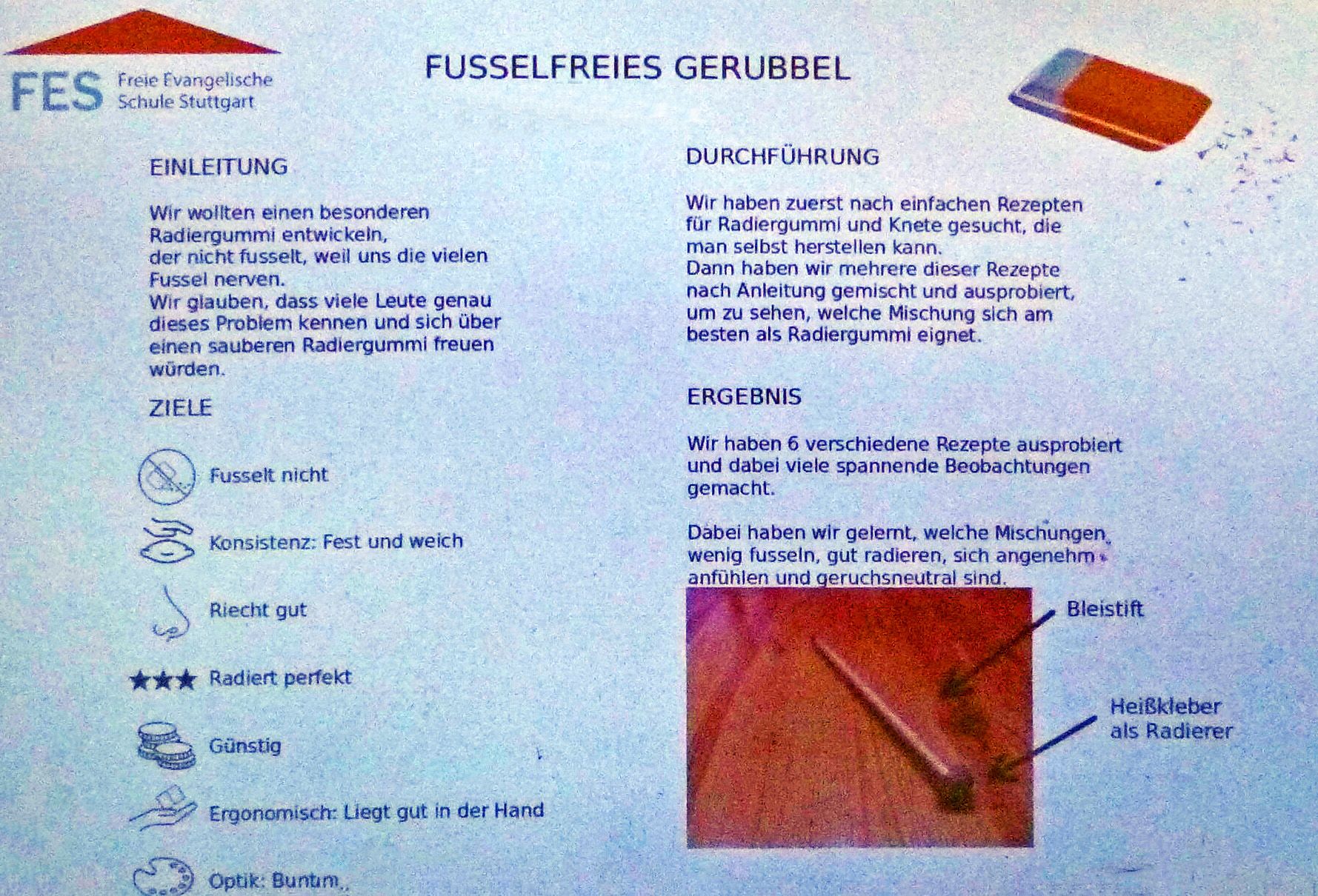 „Kann man einen Radiergummi entwickeln, der beim Radieren keine Krümel produziert? Kann man ein Bobbycar mit Motor versehen und mit umweltfreundlicher Energie betreiben? Wie entwickelt man eine Konzentrationshilfe, die Schülern hilft, konzentriert zu schreiben? Welcher Tierdung bewirkt das beste Wachstum bei Kürbispflanzen?