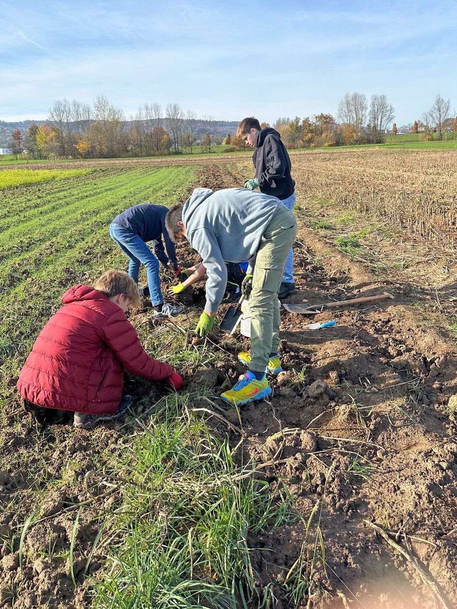 Dann hieß es: bücken, ausgraben, sammeln und aufladen. Reihe für Reihe arbeiteten sich die Schülerinnen und Schüler bei herrlichem Sonnenschein durch den Acker, bis die Körbe im Hänger gut gefüllt waren.
