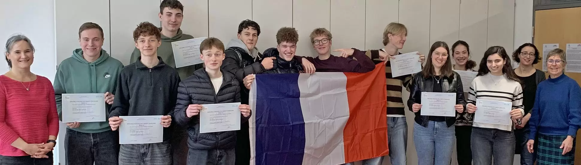 Nach langer Wartezeit auf die vom Institut Français ausgestellten Zertifikate, konnten heute zwölf Schüler und Schülerinnen ihre Diplome entgegennehmen.