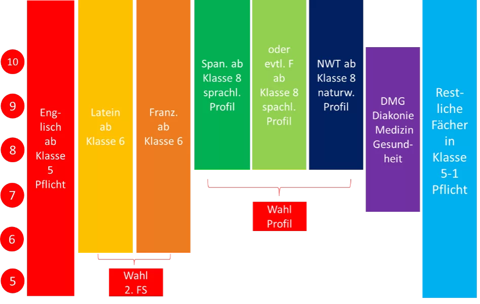 Englisch ab Klasse 5, Latein oder Französisch ab Klasse 6, Spanisch ab Klasse 8 (sprachliches Profil)